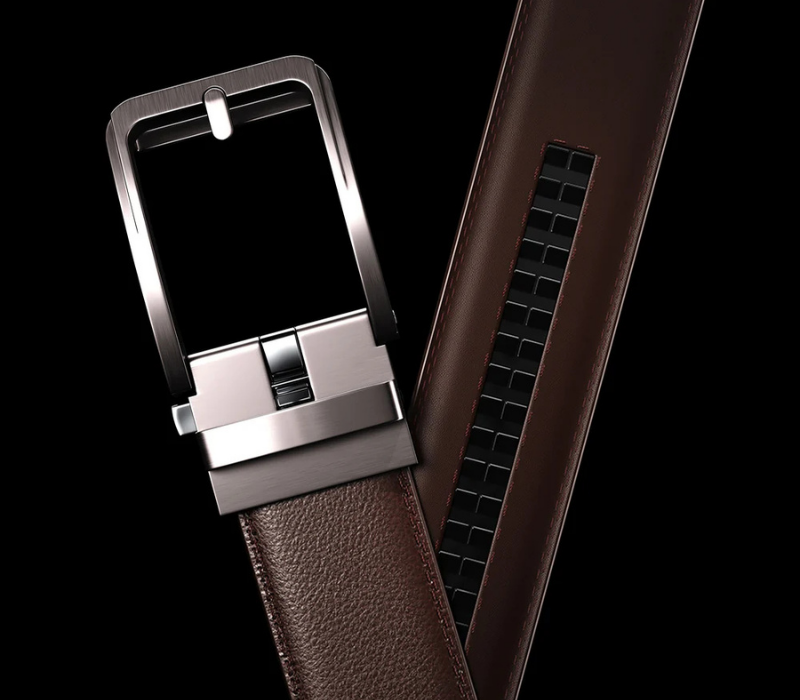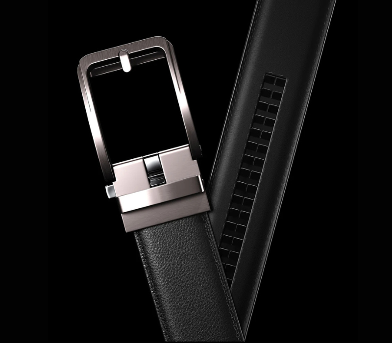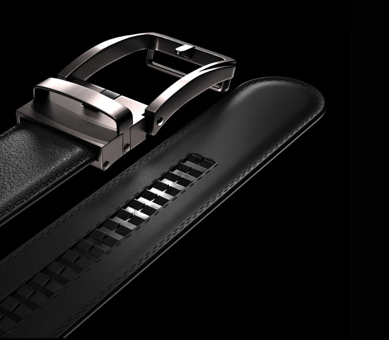 - Fijar y bloquear : inserte la correa en la hebilla, presione hacia abajo para asegurarla y deje que los pequeños dientes de metal sujeten el cuero.
