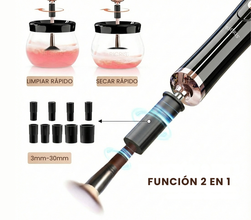 Absolutamente. El kit incluye 8 adaptadores de silicona elástica de diferentes diámetros. Estos están diseñados para ajustarse con precisión técnica desde el pincel más fino de ojos hasta la brocha de polvos más grande de tu colección.