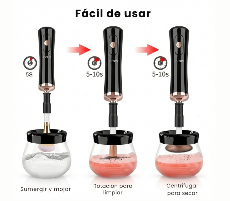 Puedes utilizar tu jabón limpiador de brochas habitual o incluso un champú neutro. Solo necesitas una pequeña cantidad mezclada con agua en el depósito para ver cómo el flujo centrífugo desprende hasta el maquillaje más resistente.