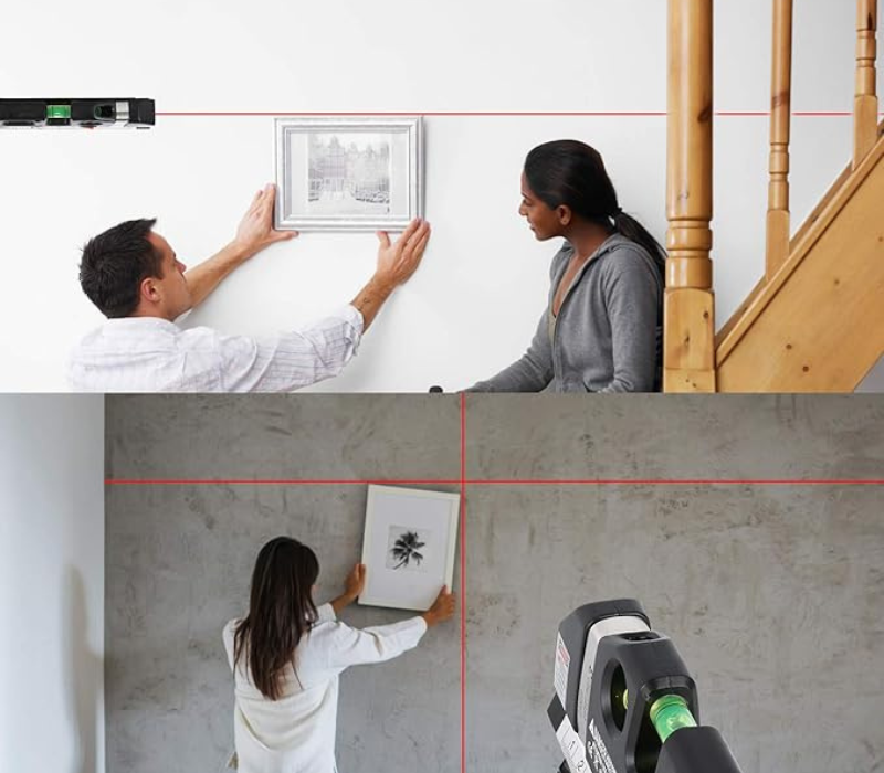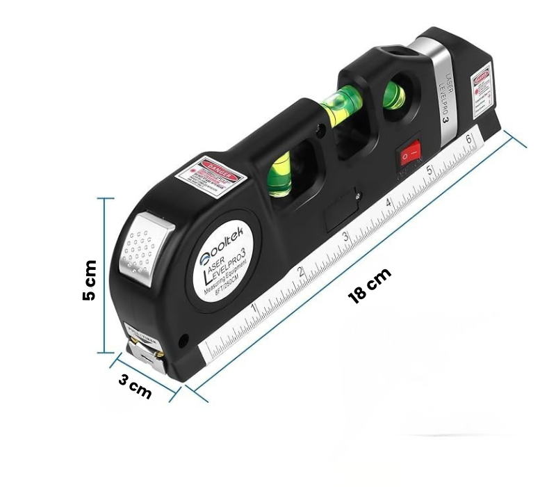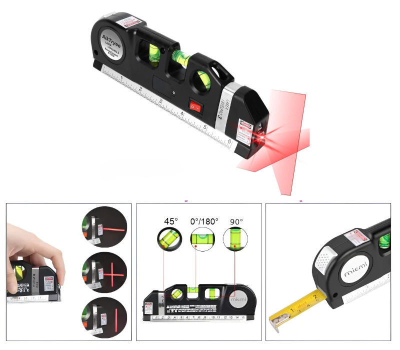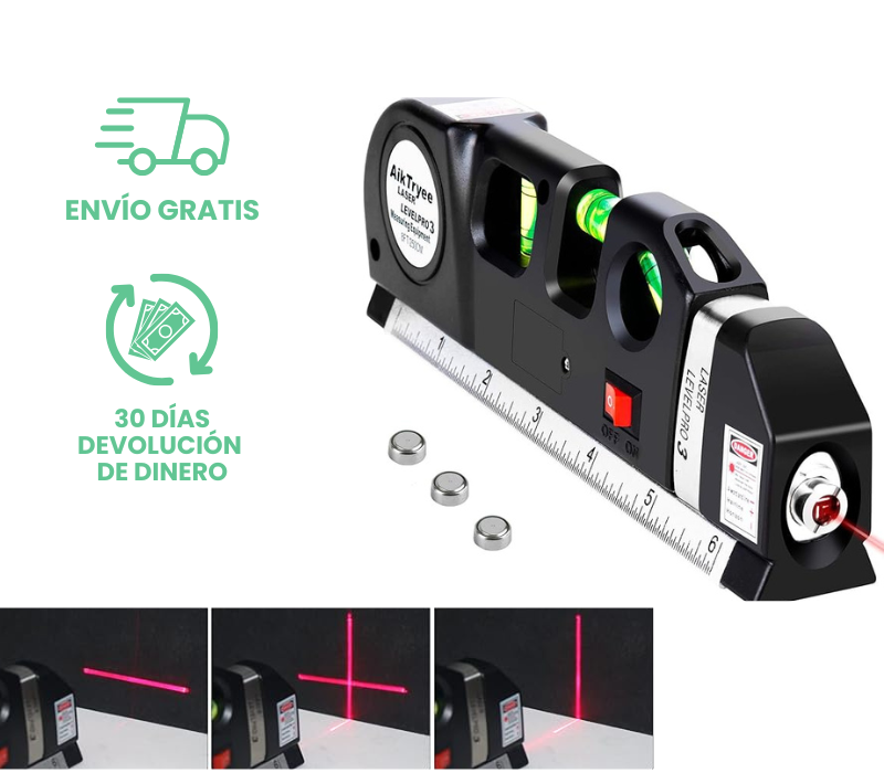 Es un nivel láser "multifuncional precisa" que integra tres herramientas: un sistema de tres puntos de nivelación, una cinta métrica de 2.4 metros y los modos de nivel láser (vertical, horizontal y en cruz).